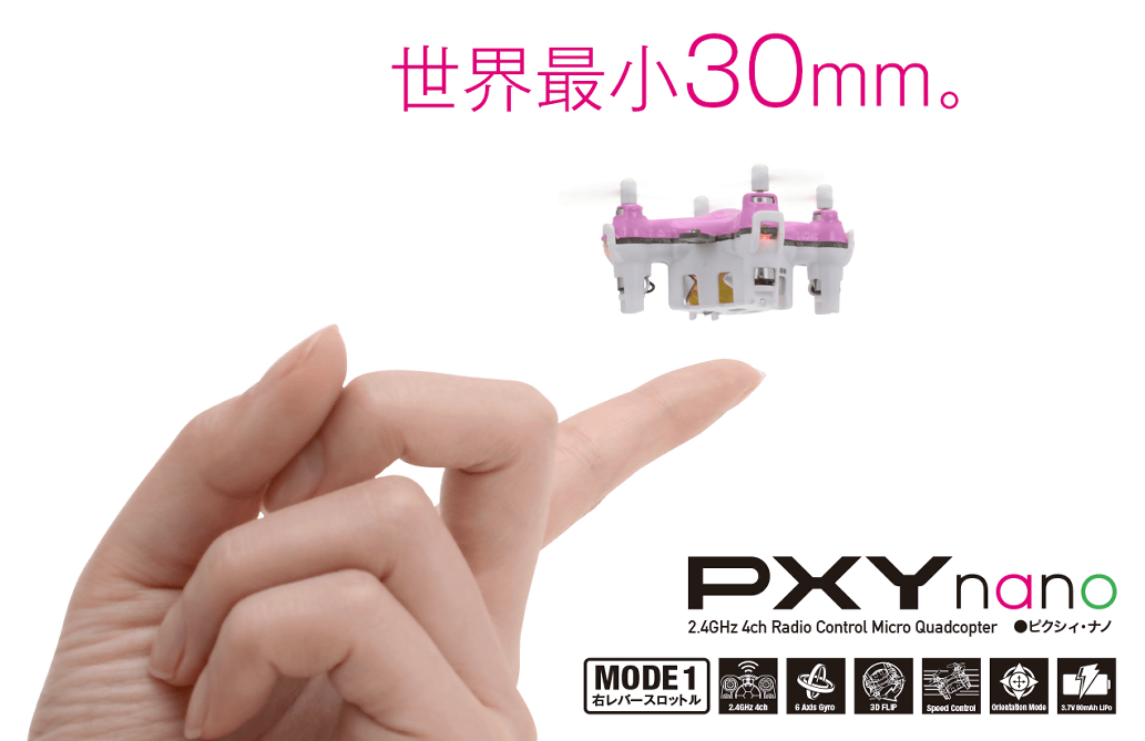 151204_01全長30mm、重さわずか7.7gで指にのるくらい小さな世界最小ドローン「PXY NANO」をG-FORCEが発売しました。6軸ジャイロセンサー内蔵で、カンタン操作で宙返りする「フリップモード」を搭載しています。PXY NANOがどんなドローンなのかは以下のムービーで確認可能。