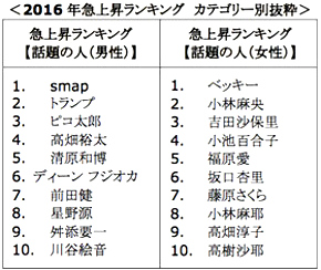 Googleでの検索量が2015年と比較して急上昇したワードをランク付けした「急上昇ランキング」では、アイドルグループ・SMAPが男性1位となった。同グループは1月に独立騒動が報道されて以来、年間を通して大きく話題となった。また、アメリカ大統領選に出馬した「トランプ」が2位に、そして”PPAP”で世界的に有名となった「ピコ太郎」が3位となった。