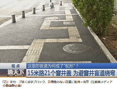 江蘇省南京市内の興隆大街(大通り)歩道に、新たに視覚視覚障害者用の点字ブロックが設置された。だが、この点字ブロック、たった10メートルほどの距離に、いくつもの曲がり角が設けられている。この道路はこのほど大々的な補修を終えたばかり。