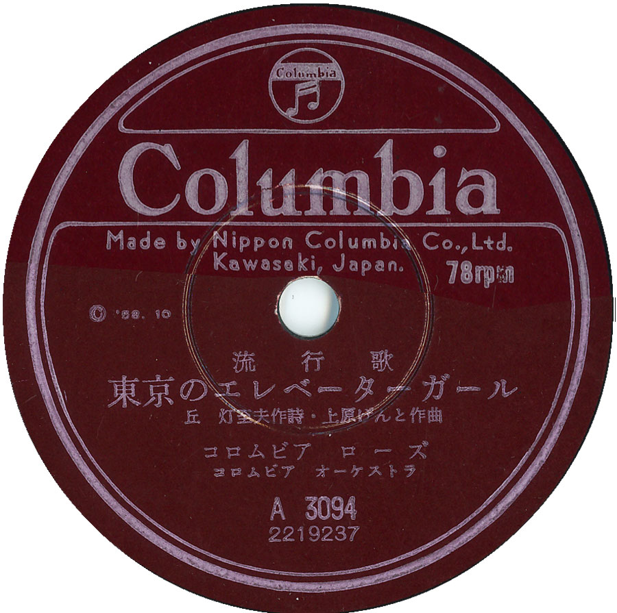 (上)SP『東京のエレベーターガール』コロムビア・ローズ コロムビアA3094 1958年10月輸出用レコード盤