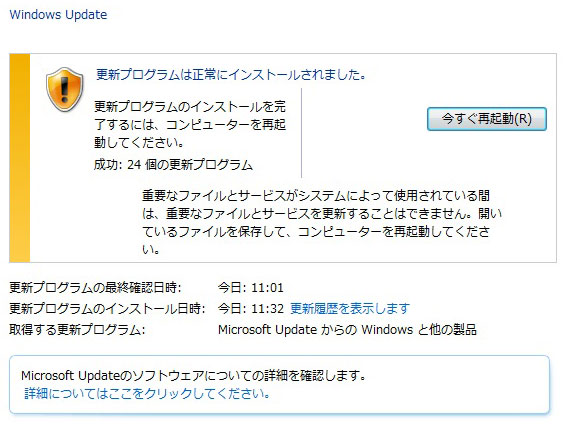 無線LANだったせいか、インストール完了まで再起動1回を含め33分、さらにクリーンアップのためもう一度再起動。