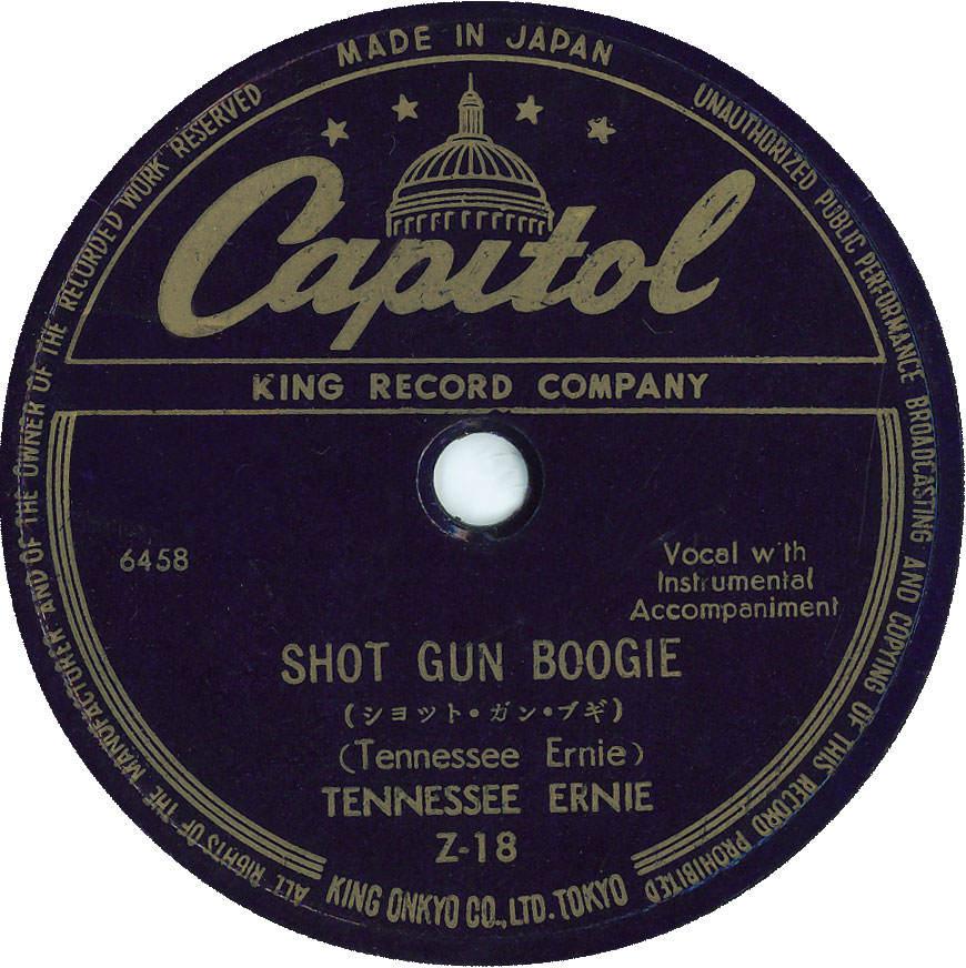 (下)日本盤SPレーベル部分『Shot Gun Boogie(ショット・ガン・ブギ)』c/w『She’s My Baby(いとしい あの娘)』テネシー・アーニー /キングレコード(キャピトル)