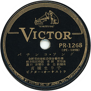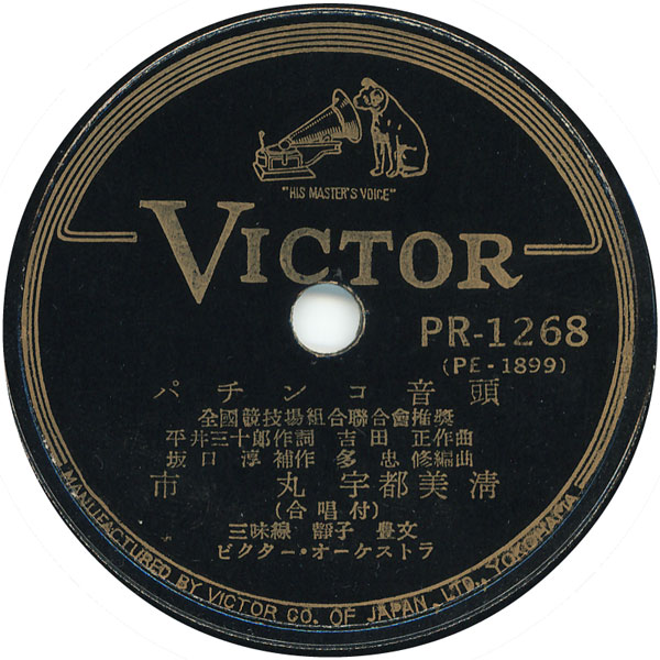 (上)SPレーベル部分と歌詞カード(表・裏)『パチンコ・ソング』宮城まり子 c/w 『パチンコ音頭』市丸、宇都美 清 ビクターPR-1268