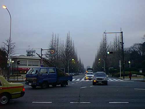 もう少し前の時期なら銀杏の葉で道路が黄色に敷き詰められて、見た目はキレイなのだが、ギンナンのニオイがすごくて犬も逃げ出すという、そういう場面がみられる。その葉っぱは時期が来ると都の職員が片付けるので、ある日とつぜんキレイさっぱり無くなる。
