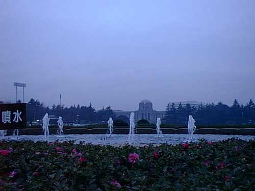 手前の噴水にわざわざ「噴水」の立札。誰が見ても噴水だ。
