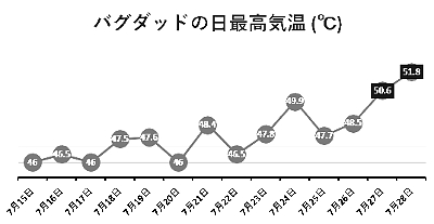 バグダッドの日最高気温の推移イラクの首都バグダッドでは27日(月)、最高気温が50・6℃まで上昇しました。さらに28日(火)には51・8℃まで上がって、同市の観測史上最高気温を記録しています。この時期の平均は44℃ですから、それを7℃以上も上回る異常な暑さに見舞われたのです。