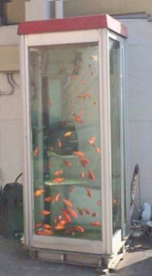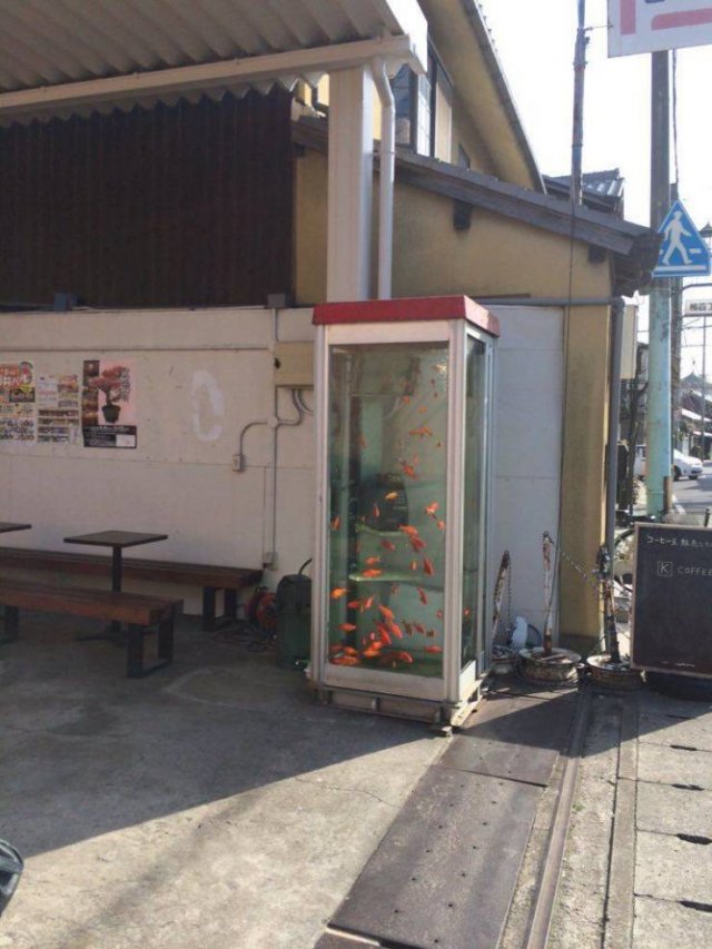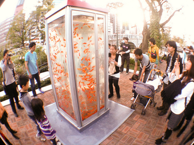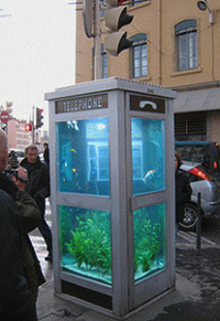 French designers Benoit Deseille and Benedetto Bufalino have built this amazing fish aquarium out of an old phone box for the Festival of Lights in Lyon, France. The Festival of Lights in Lyon is an annual event celebrating the Virgin Mary who, as the legend goes, spared Lyon from the plague n 1643. Every year on 8 December, residents of Lyon place candles outside their windows to honor the Mother of Jesus, creating a spectacular sight that attracts 4 million tourists. This telephone booth aquarium is drawing crowds and is a big hit with tourists and locals alike. This amazing conversion has turned a telephone booth into something creative and exciting. Hopefully it will spur on other artists to transform other phone booths and save them from going to the landfill.Goldfish Aquarium in a Phone Booth in Japan