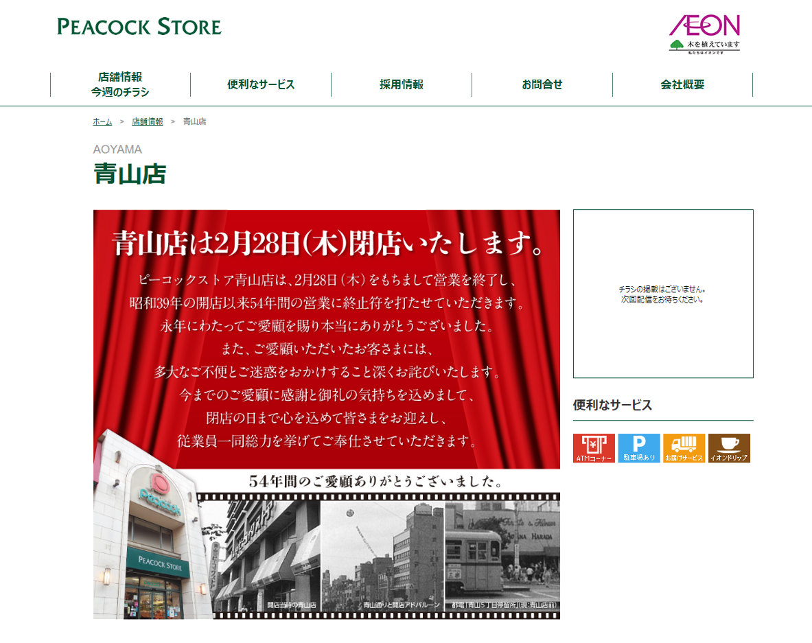 ピーコックストア青山店は1964年、百貨店・大丸のスーパーマーケット関東進出1号店として開業しました。利用者らの声を受け、店の目の前にバス停ができるなど、長年にわたって住民の生活を支えてきましたが、入居するビルの建て替えに伴い、54年の歴史に幕を下ろすことになりました。<東京・南青山で”買い物難民”の危機 ピーコックストア青山店が閉店(TOKYO MX)- Yahoo!ニュース より一部引用>