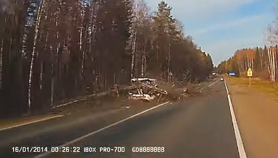 ロシア・イジェフスクの針葉樹が生い茂る郊外でドラレコが撮影していたショッキングな動画がこちら。突然目の前に木が倒れてきた瞬間が捕らえられています。